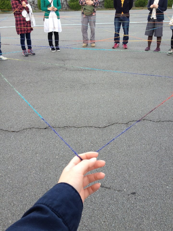 カラフルな紐を巻き付けてボールみたいにして、それを次々と投げ渡して繋がったぼらいやーの仲間たち。